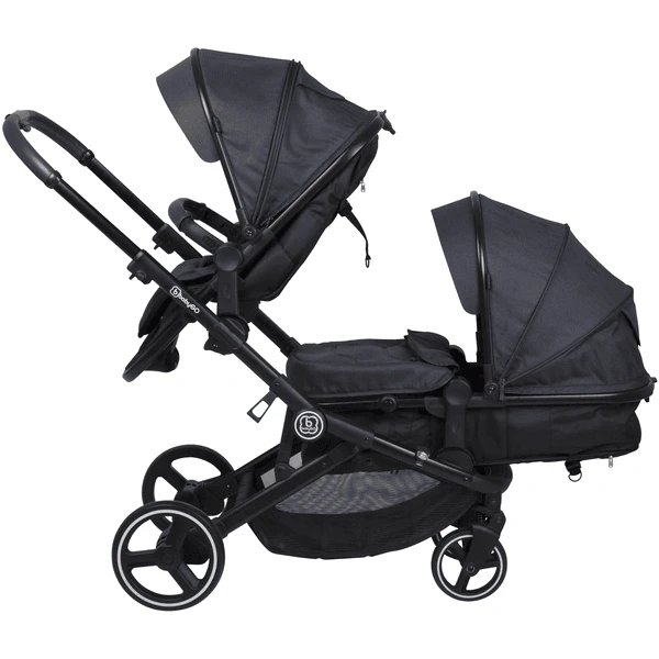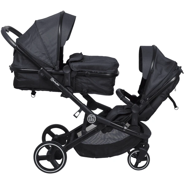 De twee stoelen zijn op verschillende hoogtes op het stabiele aluminium frame gemonteerd. Hierdoor hebben beide kinderen een vrij uitzicht. De afneembare en zacht gestoffeerde hoes is gemaakt van huidvriendelijk materiaal en is babyGO getest op gevaarlijke stoffen. Als er iets misgaat, is het makkelijk schoon te maken. De uitrusting omvat een geschikte en verstelbare kap voor elke stoel. Het wordt aangevuld met een uitneembare uitklapbare zonwering op de kap. 5-puntsgordelsystemen zorgen voor maximale veiligheid voor de kinderen bij elke rit. De grote wielen beheersen zelfs moeilijke oppervlakken.