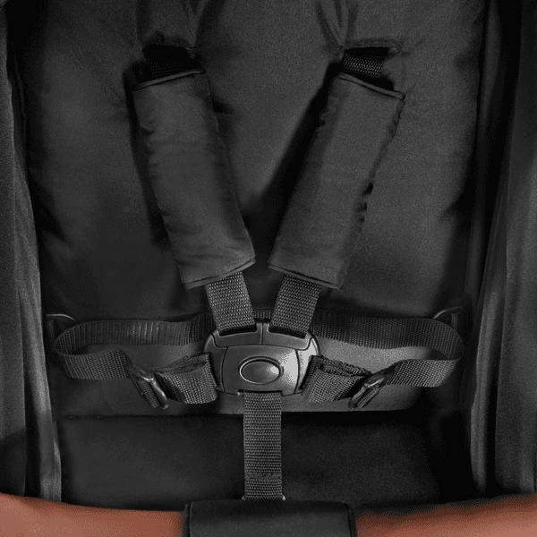 - De kinderwagen heeft een gepatenteerde bescherming tegen zijdelingse impact, een gevoerde 3-puntsgordel en kan rechtstreeks vanuit de auto aan de wandelwagen worden bevestigd